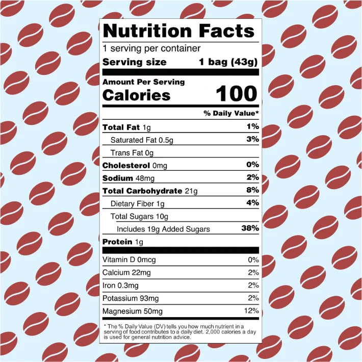 Filtreret vand, rørsukker, brun rissirup, kakaopulver (7%), robusta kaffe (2%), græskarkerne-smør, basilikumfrøpulver, salt, vaniljeekstrakt, koffein, magnesiumoxid, kaliumsorbat.
